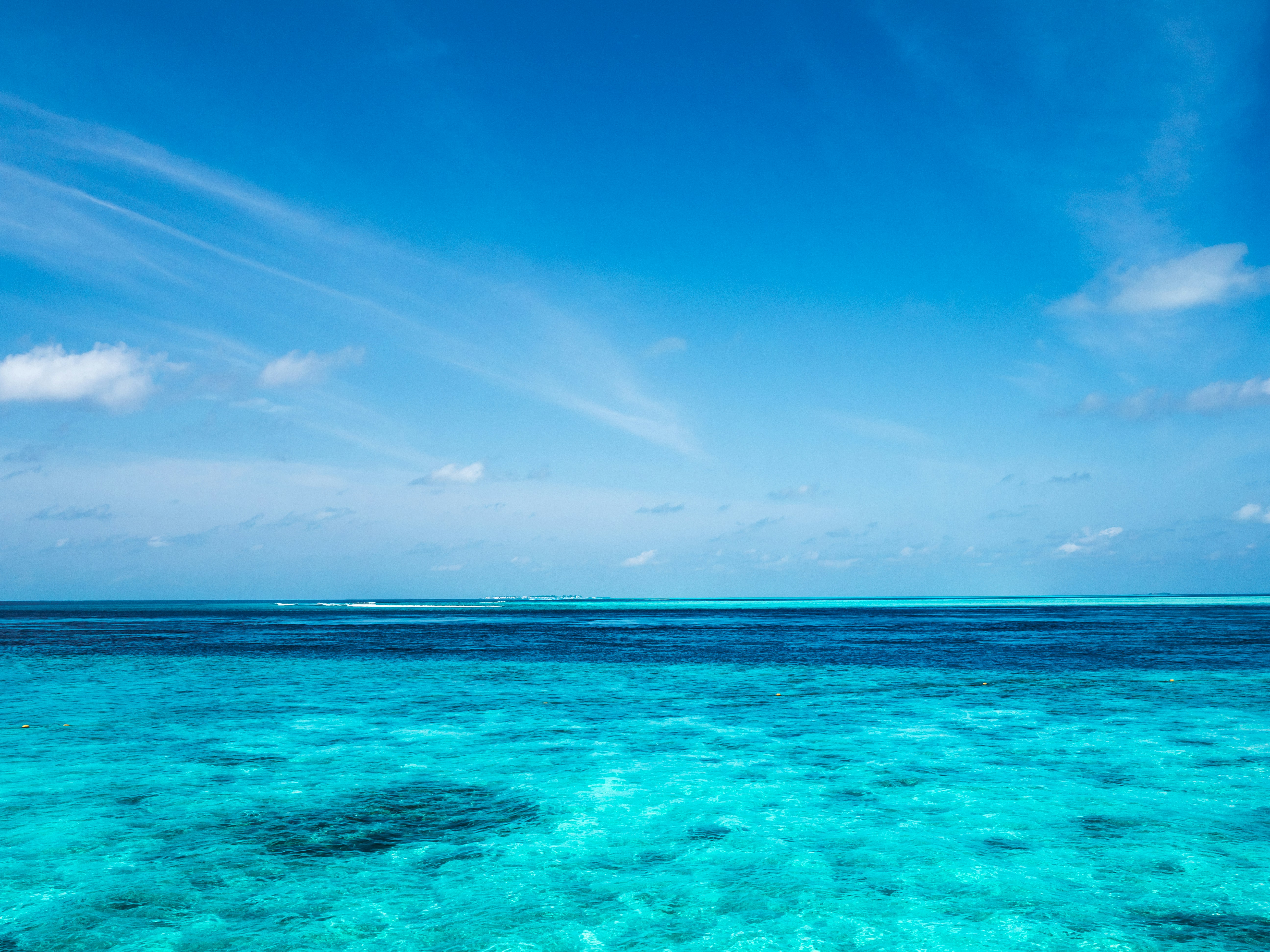 รูปการสังเกตสีของน้ำที่บ่งบอกถึงน้ำลึกสีเข้ม กับน้ำตื้นที่จะพบแผ่นดินสีอ่อน
