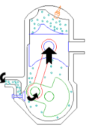 3) ในรูปด้านบน ที่ด้านบนเหนือลูกสูบ มันเริ่มต้นกระบวนการจุดประกายไฟที่หัวเทียน ที่เรียกว่า การระเบิด (Blowdown) ใกล้จะเสร็จสิ้น ลูกสูบเลื่อนลงเปิดช่องพอร์ทเพื่อถ่ายเทไอเสีย ลูกสูบต่อเข้ากับก้านสูบมีท่อส่ง